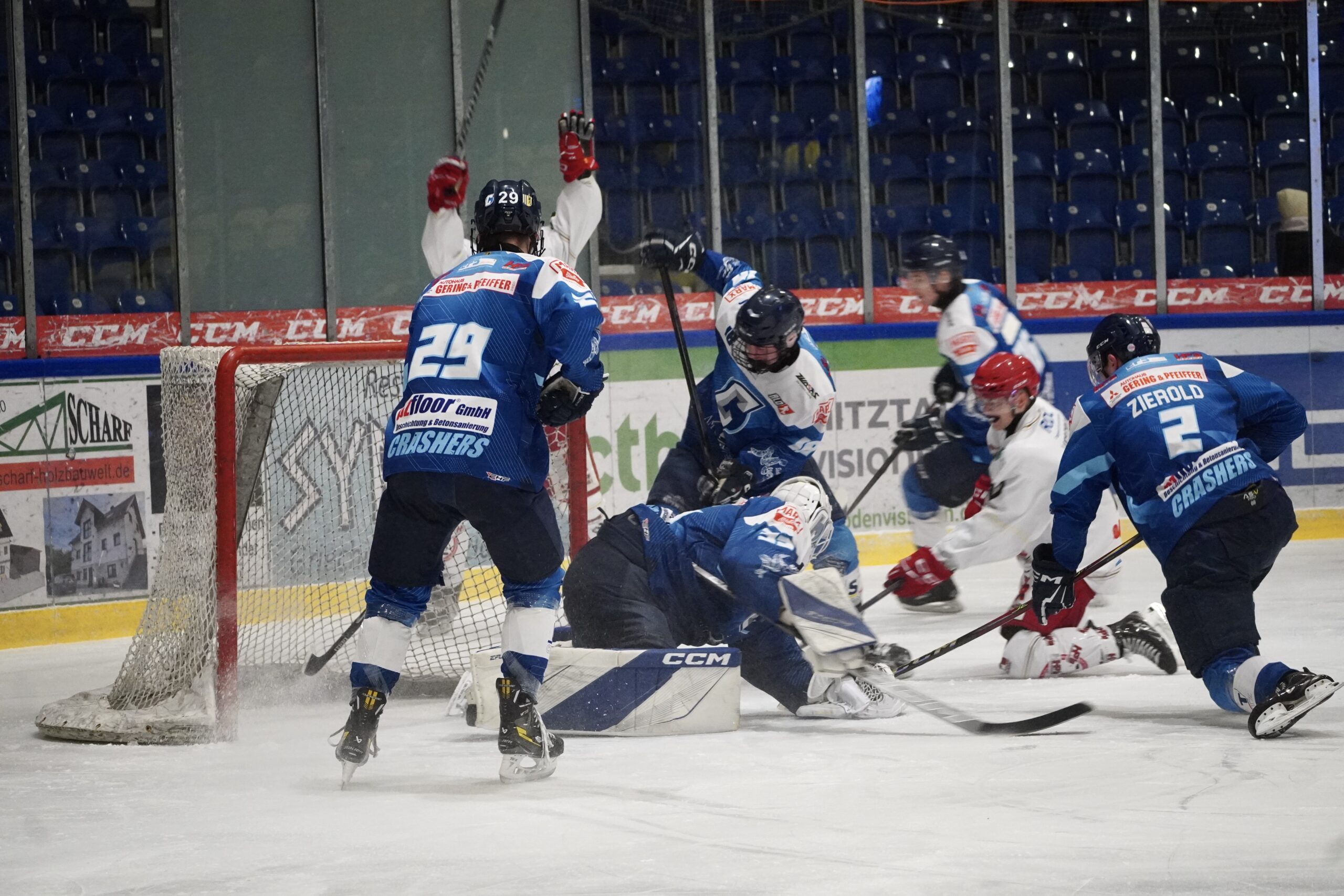 Die Crashers starteten mutig in die Partie und setzten früh ein erstes Ausrufezeichen: Brian Sittel hatte die erste Großchance des Spiels, zögerte jedoch einen Moment zu lange vor dem Berliner Tor und scheiterte am Gäste Keeper Steffen. Danach übernahmen die Hauptstädter die Kontrolle. Mit aggressivem Forechecking drängten sie die Crashers in die eigene Zone und prüften Goalie Kopp immer wieder. Der zeigte eine starke Leistung, war in der 6′ Spielminute jedoch machtlos, als Thielsch eine Vorlage von Noack zur 1:0 Führung für Berlin verwertete.
